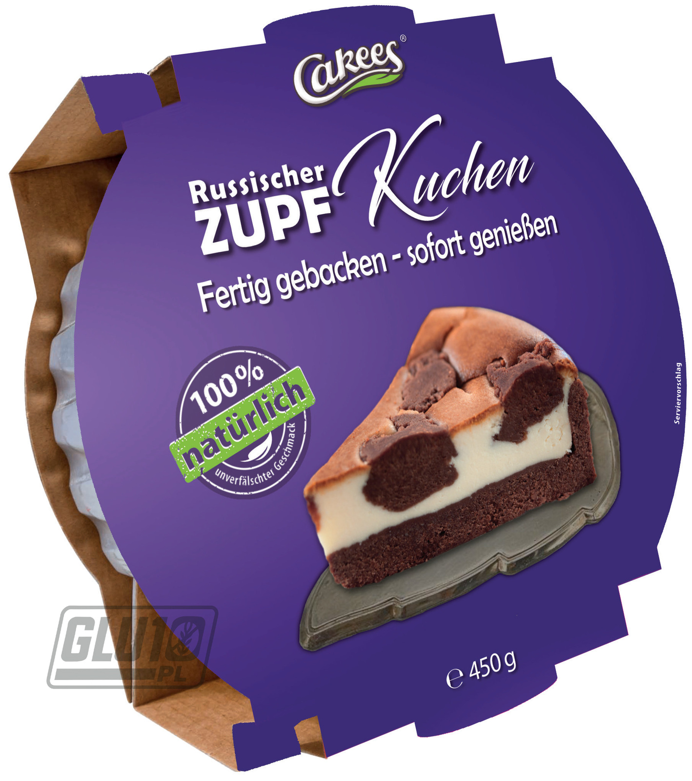 Rosyjski sernik Cakees® z czekoladowym ciastem i warstwą twarogu są pieczone w specjalnej blasze do pieczenia/transportu i natychmiast szczelnie zamykane. Wysoka temperatura wewnątrz ciasta podczas pieczenia sterylizuje ciasto i zapewnia jego bezpieczeństwo przed zarazkami. Ten specjalny proces pieczenia pozwala na przechowywanie w temperaturze pokojowej przez wiele miesięcy. Wytrzymałe opakowanie kartonowe ma zagięcia, które zapewniają ciastu jeszcze większą stabilność w specjalnej blasze do pieczenia/transportu. Jest to szczególnie praktyczne, jeśli chcesz zabrać ze sobą wytrawne rosyjskie ciasto rozciągane z czekoladą na wędrówki i wycieczki.